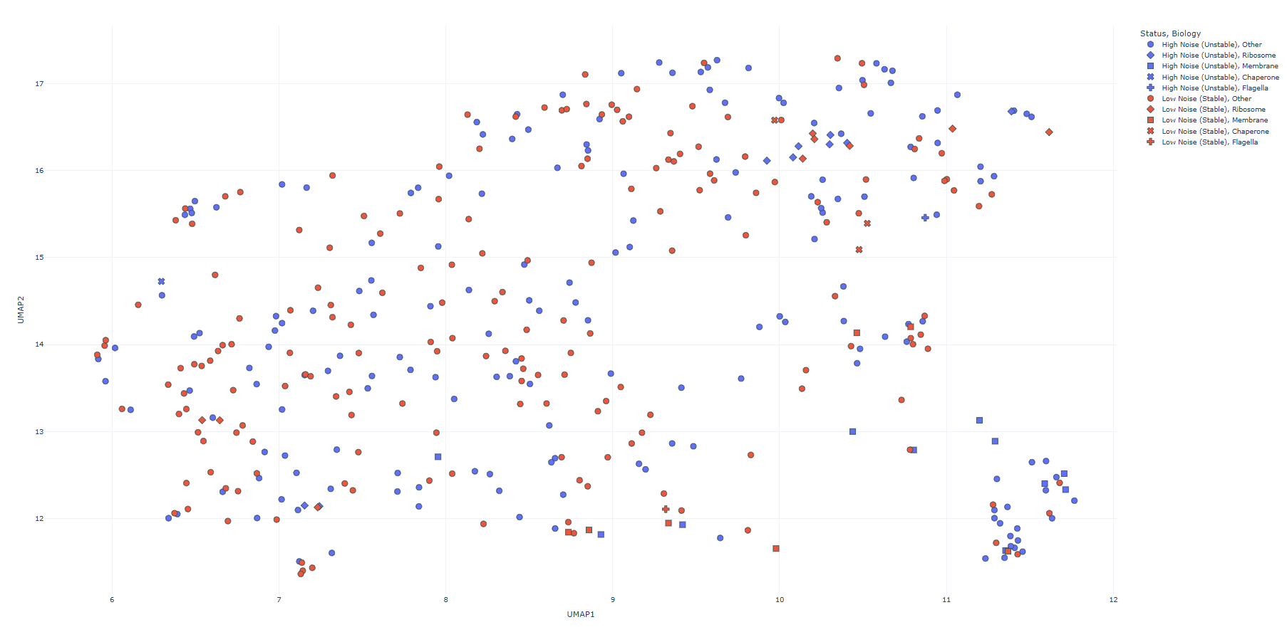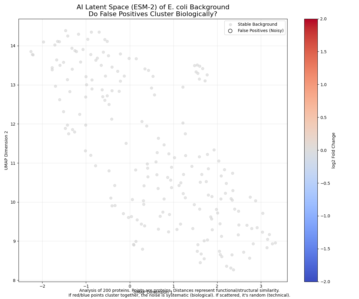 The embedding analysis did not indicate any bias toward a particular biochemical class. Points are well mixed, which is expected. ESM-2 cannot “discover” false positives in this pipeline, because false positives are driven by measurement noise, missingness, variance structure, and the statistical model. A sequence-only model (with E. coli amino acid sequences retrieved via the UniProt API) does not have access to that axis of information.