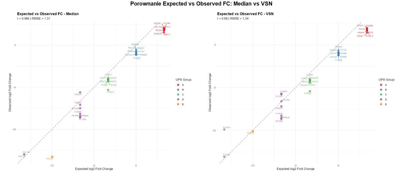 Expected vs observed log2FC for UPS proteins. Median normalization: r = 0.986. VSN: r = 0.98. The dashed line shows perfect agreement (y = x). Both variants show very high trend agreement.