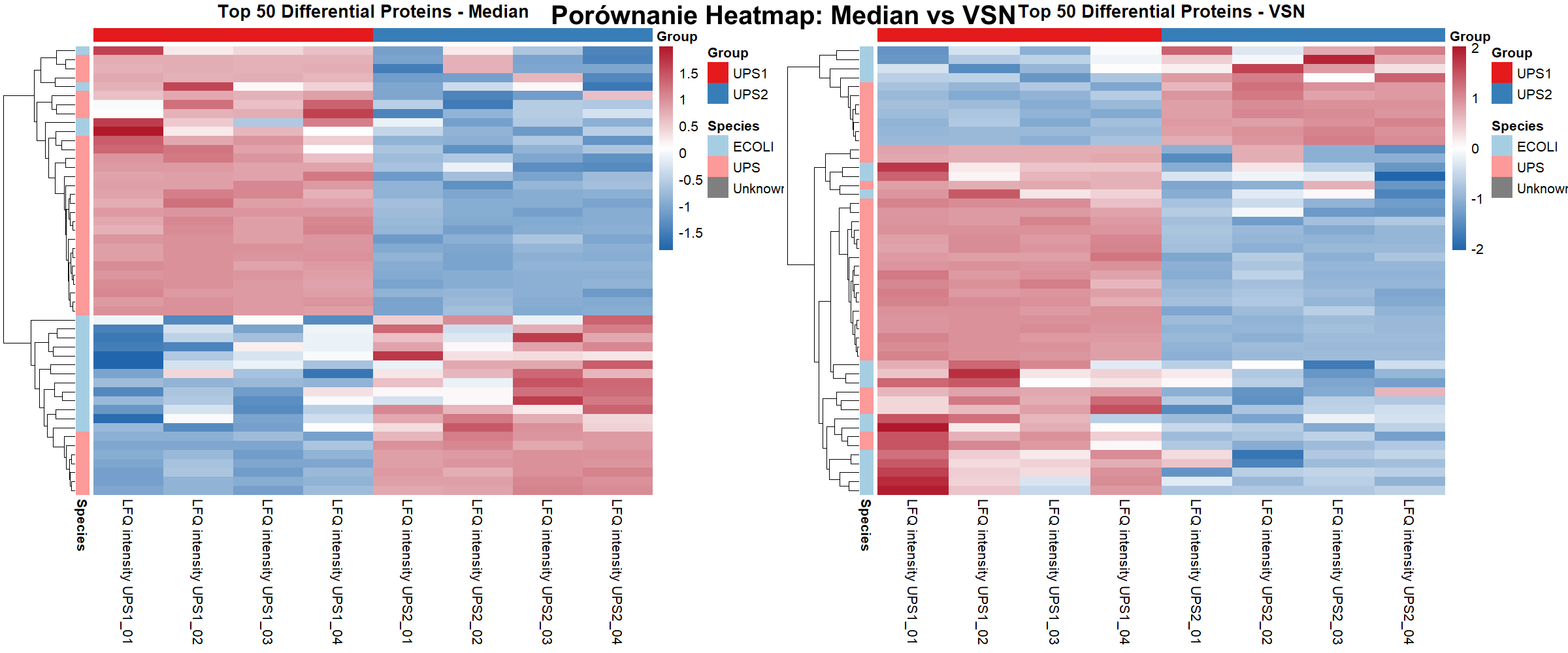 Heatmap of the 50 most differential proteins (z-score) for median and VSN normalization. Both variants show consistent UPS1 vs UPS2 patterns among top-ranked proteins, supporting robustness to the normalization choice.