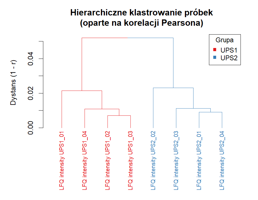 Hierarchical clustering of samples using distance 1 − Pearson r. UPS1 and UPS2 form two main clusters, supporting replicate consistency and indicating no dominant batch effect.