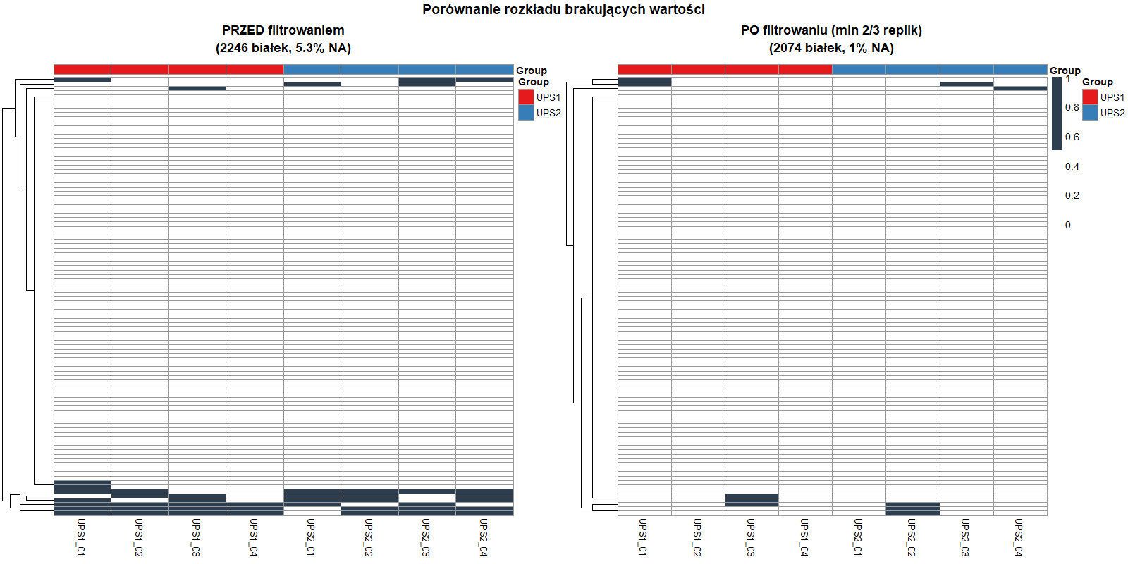 Figure 1. Missingness map before and after filtering. Rows are proteins, columns are samples from UPS1 and UPS2 (with a Group annotation bar). Cell color encodes missingness: light = present (0), dark = missing (1). Filtering required ≥3/4 values in each group (UPS1 and UPS2), reducing missingness from 5.3% to 1.0% and the protein count from 2246 to 2074.