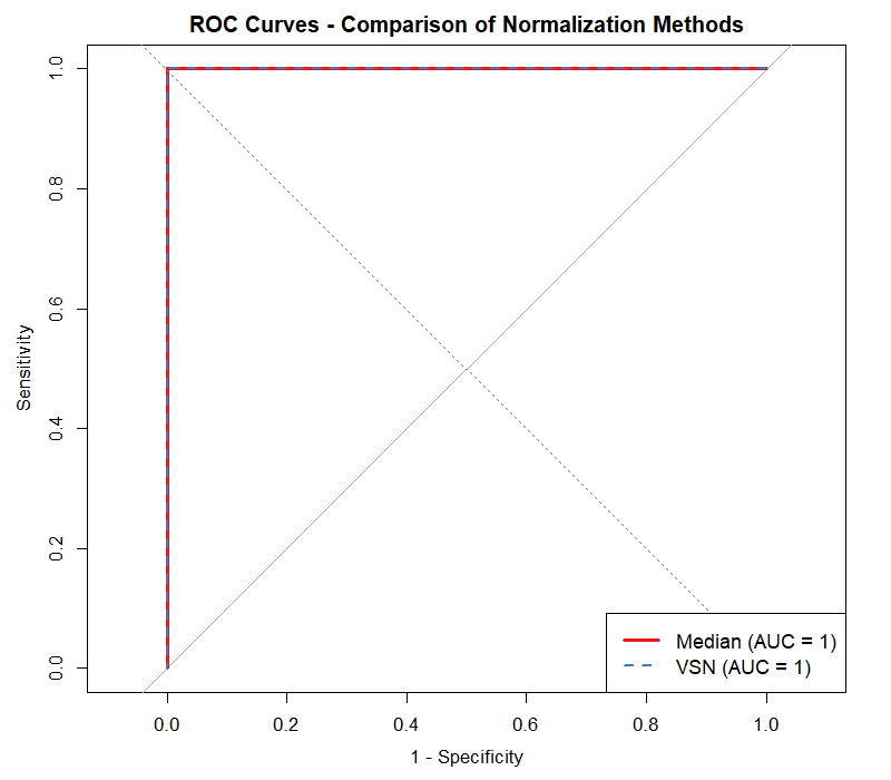 ROC curves for the normalization variants. Both achieve AUC = 1.0, i.e., ideal separation of UPS vs _E. coli for this analysis configuration._