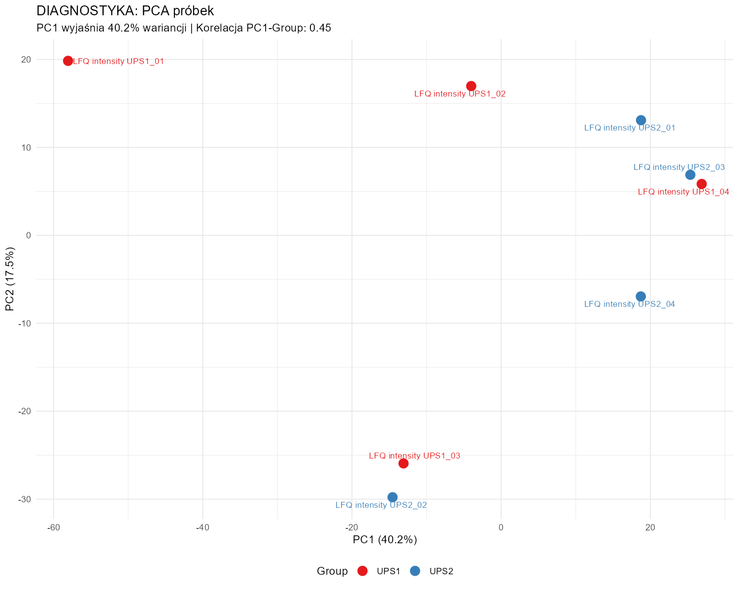 Sample PCA. PC1 explains 40.2% of variance and shows a moderate correlation with group (r = 0.45); PC2 explains 17.5%. Partial separation is expected in spike-in experiments because most _E. coli background proteins do not change between groups, and the group signal comes primarily from UPS proteins._
