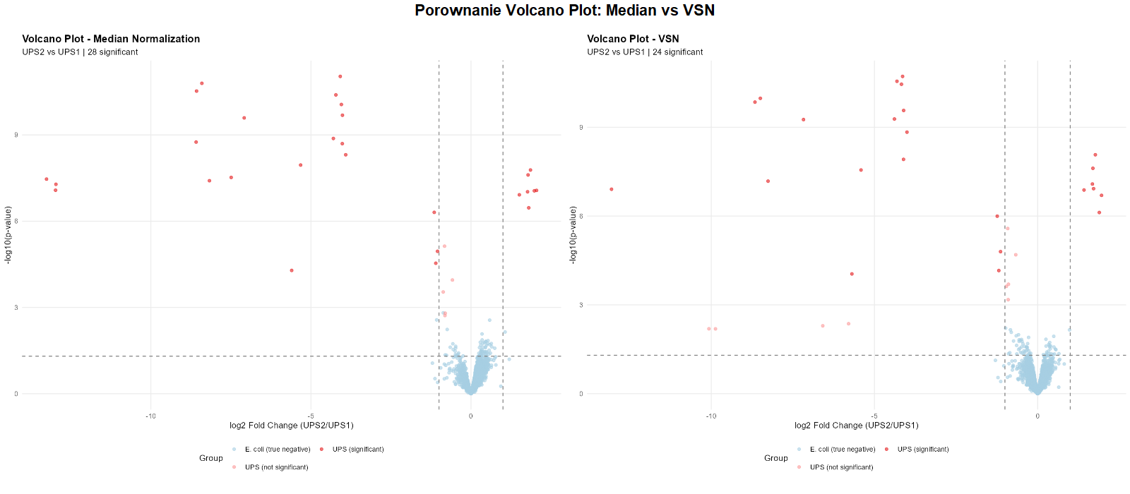 Volcano plots (UPS2 vs UPS1) for median and VSN normalization. Thresholds: adj.p < 0.05 and |log2FC| > 1. Both normalizations show a similar result pattern and comparable numbers of significant proteins.