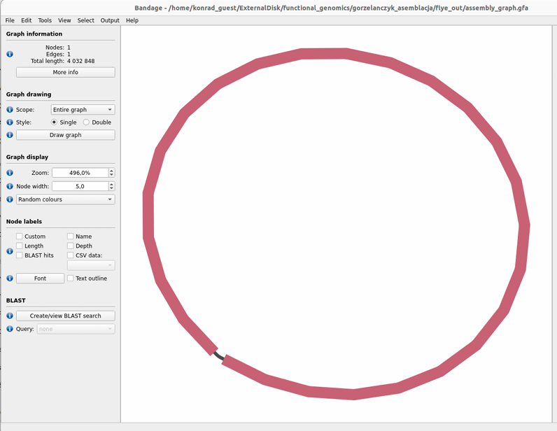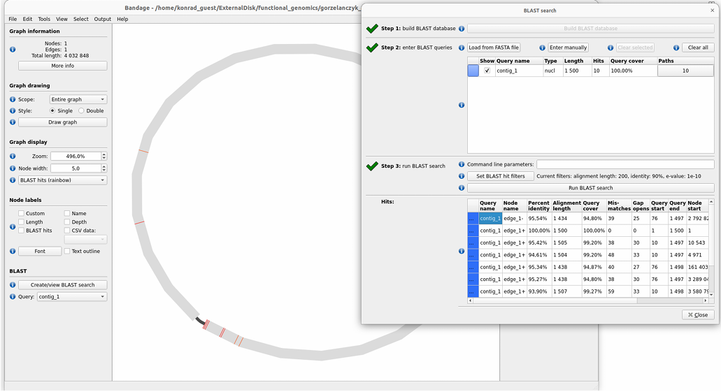 I was a bit curious what this BLAST on the left side at the bottom means. From what I read, in Bandage this BLAST panel is used so that I can attach biological information to the assembly graph. I provide a query sequence (e.g. 16S rRNA, a resistance gene, a plasmid marker). Bandage runs BLAST locally and then: - highlights graph nodes that contain hits, - allows filtering hits by E-value, % identity, alignment length, - allows describing the graph with labels like “here is 16S”, “here is blaTEM”.