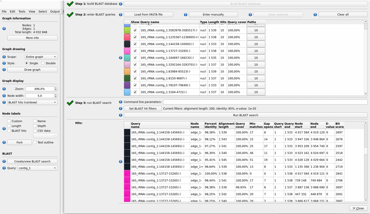 Here we have written how many 16S it detected. This is an interesting situation, because 16S is multi-copy and in Bandage BLAST should give many hits in different places of the contig. Hits have high sequence agreement (often ~95 - 100% identity), and differences (mismatches, gap opens) indicate variants between 16S copies and possible small consensus errors after Nanopore reads.