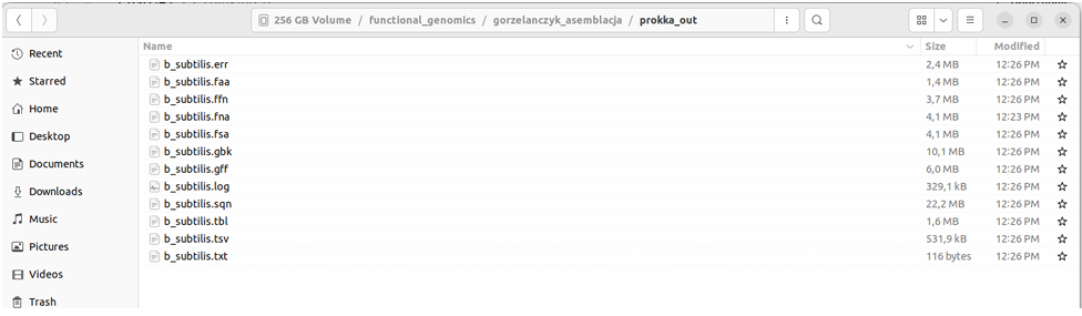 At the end Prokka writes a complete set of output files in prokka_out with prefix b_subtilis, usually in formats used later in analyses, such as an annotation file (GFF/GBK), a list of genes and proteins (FASTA), and summary tables.