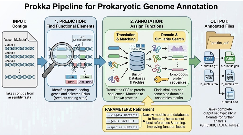 Then it translates predicted CDS into protein sequences and assigns functions to them through matching to built-in databases and profiles, meaning it searches for similarity to known proteins and conserved domains, and compiles the results into a consistent annotation.