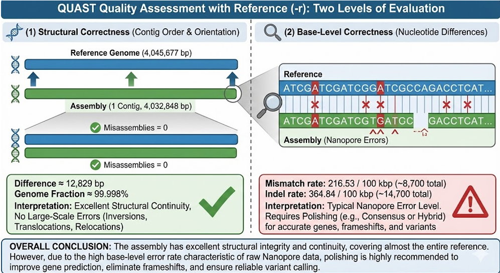 At the same time, base-level quality is typical for raw Nanopore data, because it reports 216.53 mismatch/100 kbp and 364.84 indel/100 kbp.